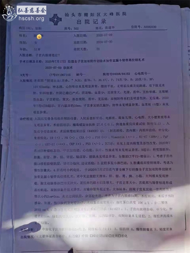 老伴:陈某华、今年53岁,二级精神残疾、本人于2020年07月9号在潮阳大峰医院确诊子宫内膜增殖症,于本月30号康复出院。