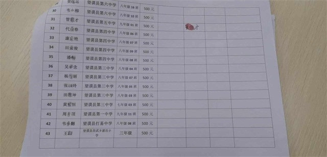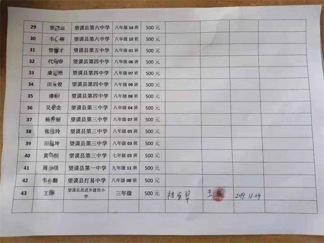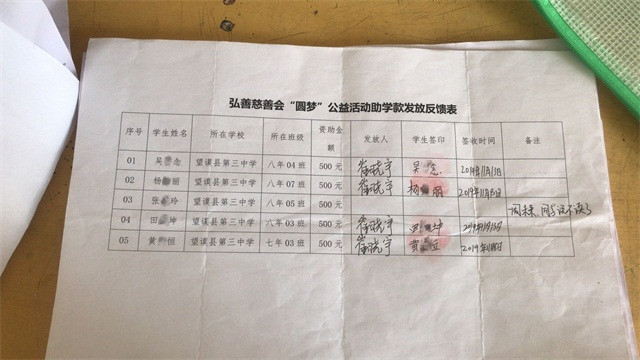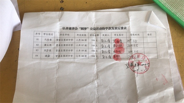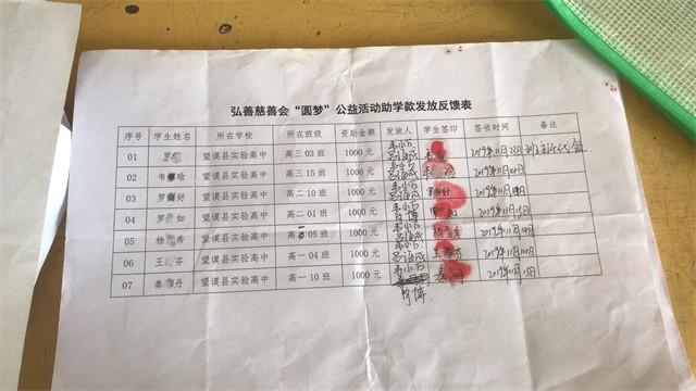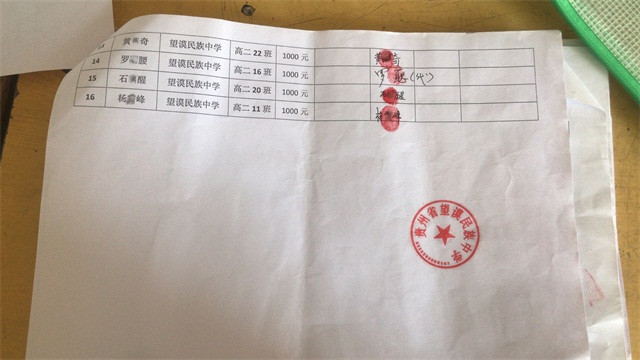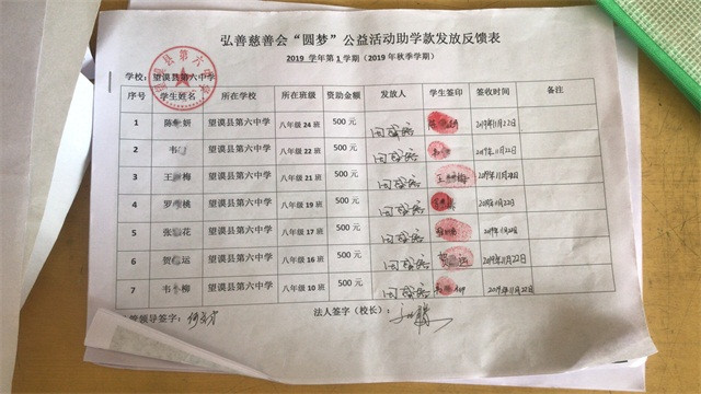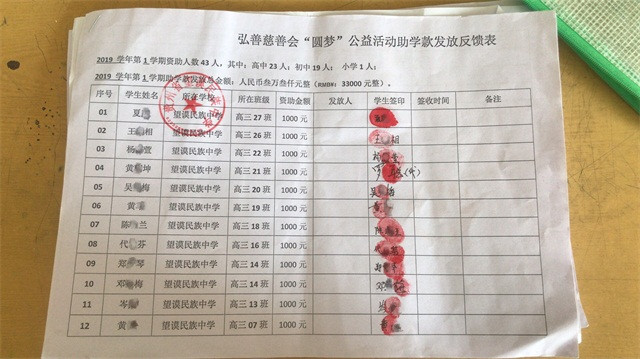 近日,慈善会助学项目由众爱心人士捐赠的助学善款,委托支教老师们发放到望谟民族中学、望谟第二中学、望谟第三中学、望谟第四中学、望谟第六中学、昂武渡邑小学等校的贫困学子手中,此次发放的助学金是2019-2020第一学期的助学金,共计3.25万元。(韦某翻同学因生病在家,助学金将由慈善会义工直接转到孩子父母账户中)