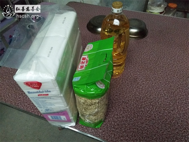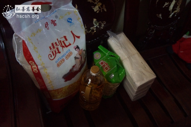 慰问物资:10kg贵夫人大米1袋、1.8l金龙鱼玉米胚芽油1瓶 、红萝卜面1袋、好生活面巾纸1提
