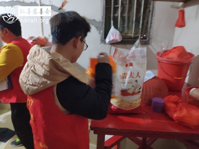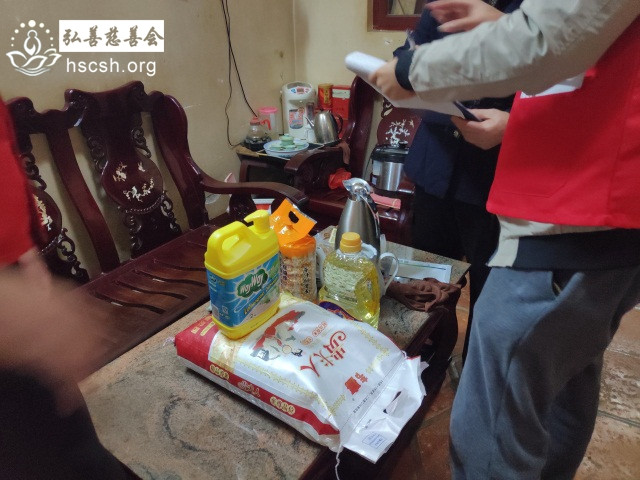 慰问物资:大米1袋、油1瓶、洗洁精1瓶、酱料菜1份