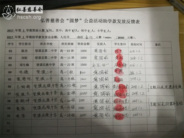 注:部分资助生是义工们到学校补充了解情况后增加,所以交由段队长代签后续发放。感恩江西师范大学研究生支教团的老师们的帮助!