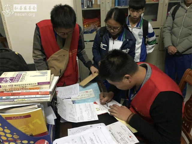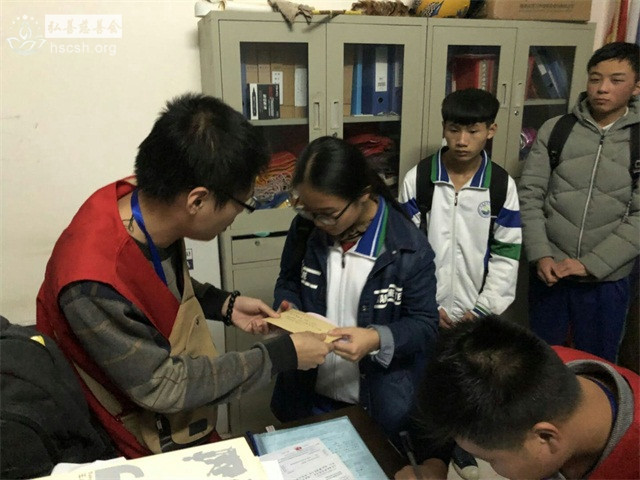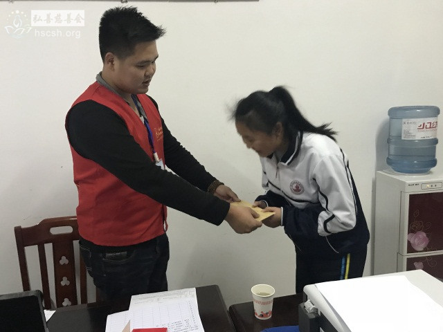 在支教团队长及老师们的协助下慈善会义工到学校发放助学金