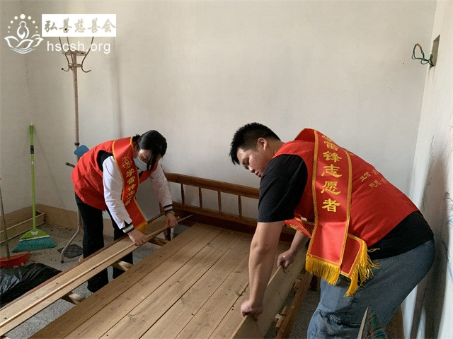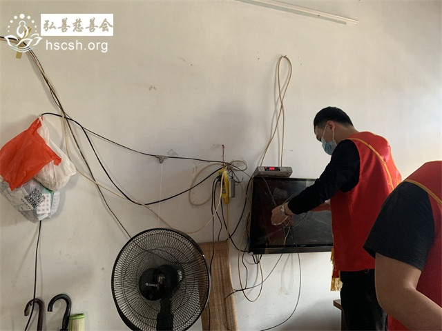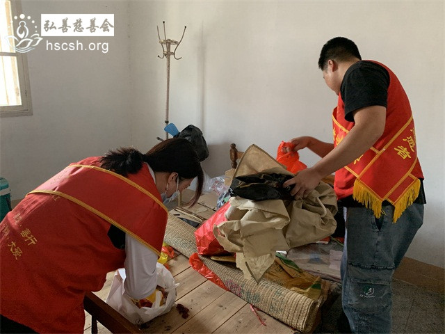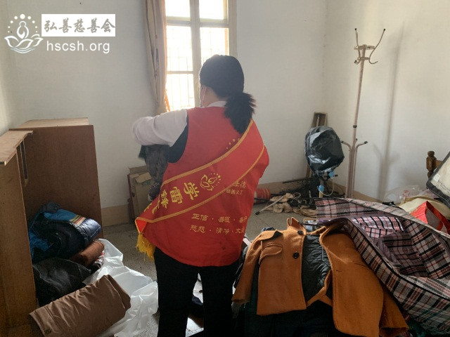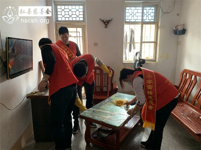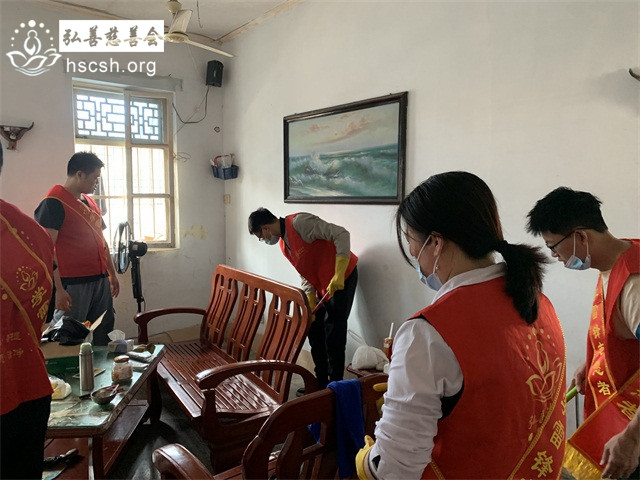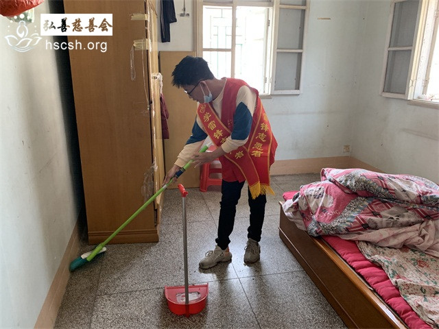 今早弘善慈善会组织志愿者到本地孤寡老人家中帮忙清扫卫生,收拾生活环境。老人老 伴早逝,儿子也因事故去世,媳妇改嫁,老人独自照顾年幼的自闭症孙子,需时刻跟紧 在孙子身边,无法工作也无暇收拾生活环境。志愿者们用行动表达关心,敬老爱老助老 ,需要的是真心的关爱、细心的照护。