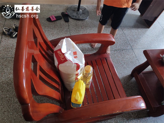 慰问物资:大米1袋、油1瓶、面1袋、洗洁精1瓶、绿豆薏米一份