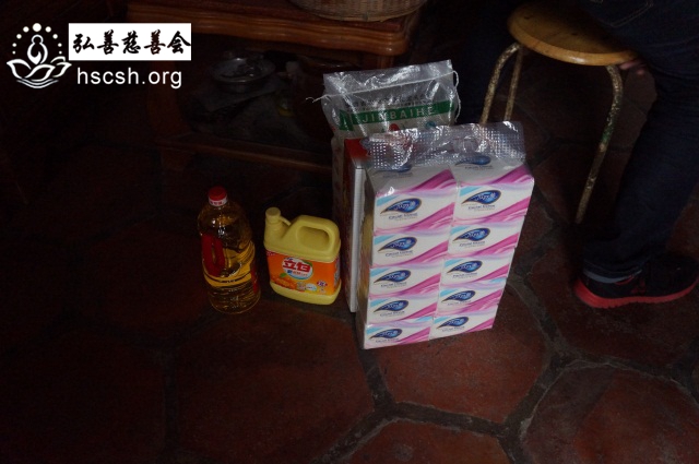 慰问物资:10kg金百合米1袋、1.8l金龙鱼调和油1瓶、欣然美抽式面巾纸1提、立白洗洁精1瓶,吉祥面一箱。