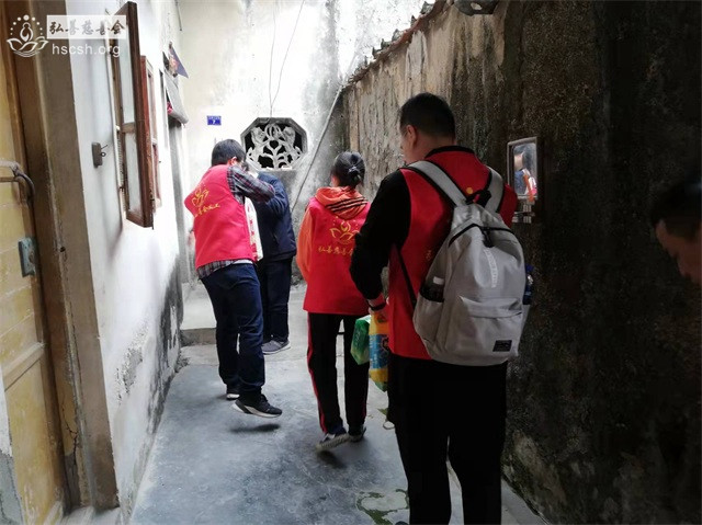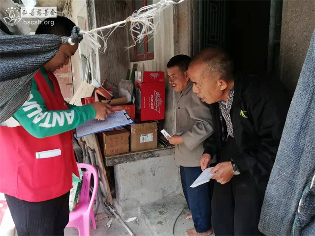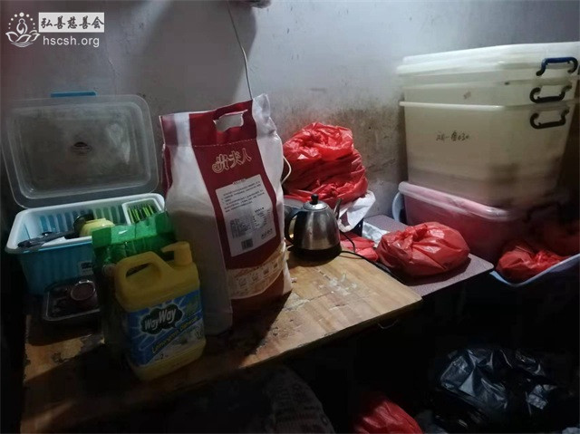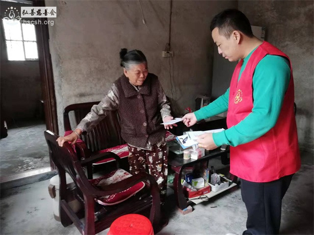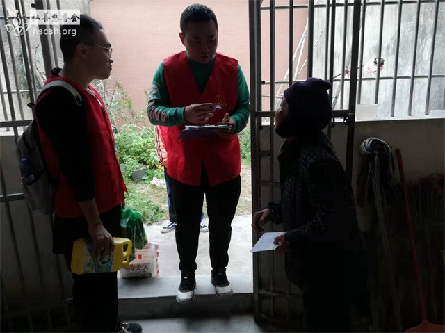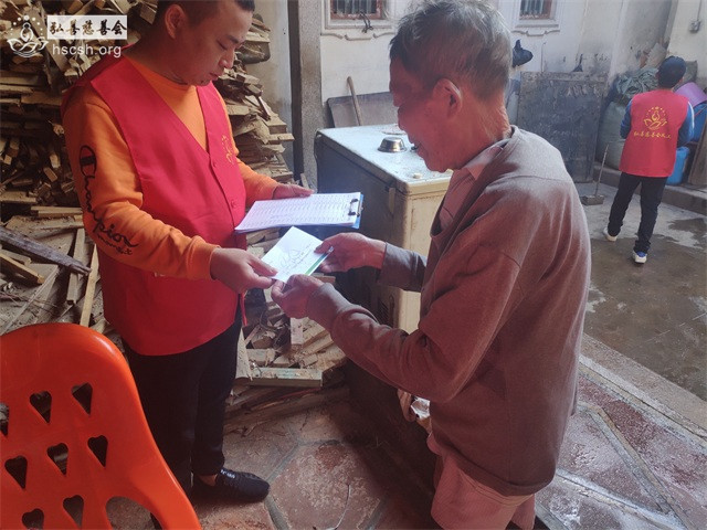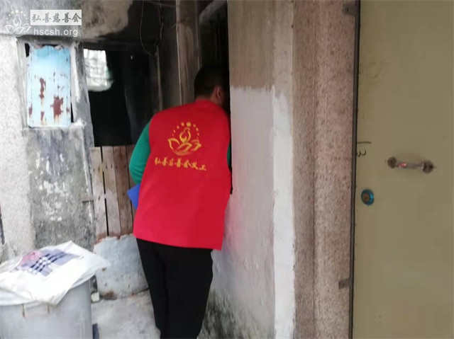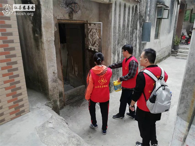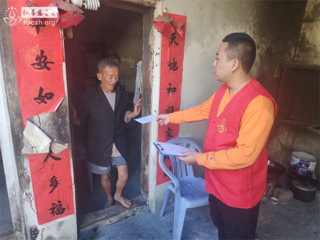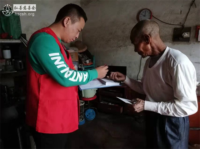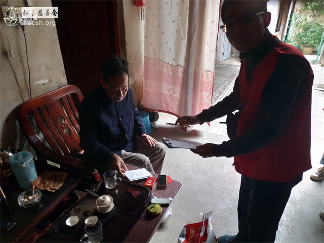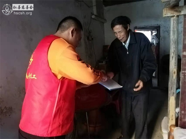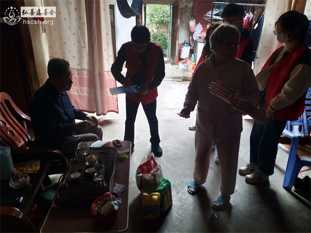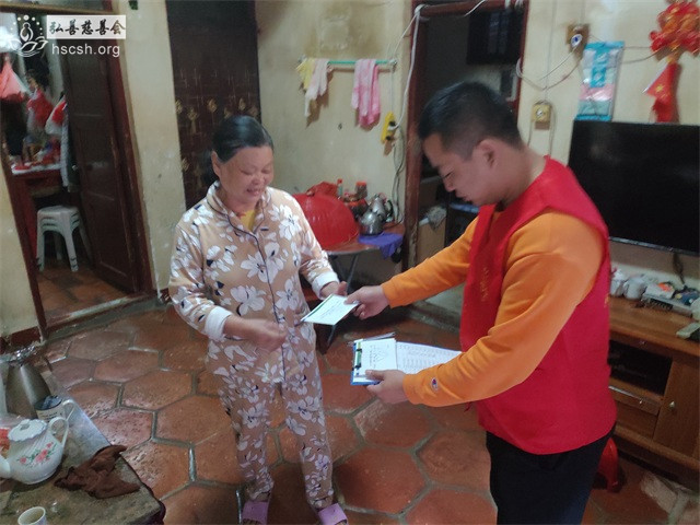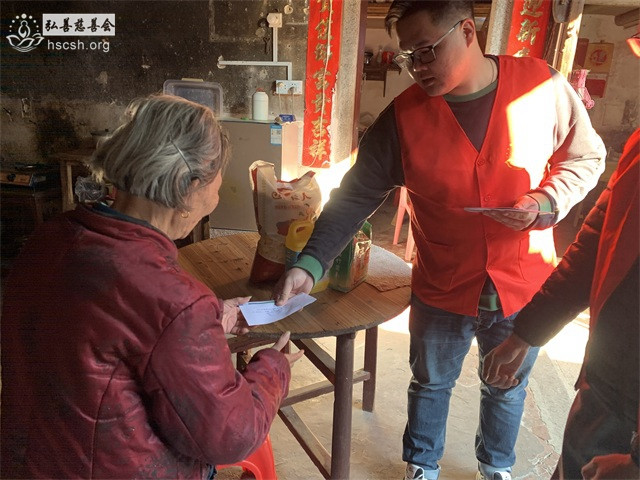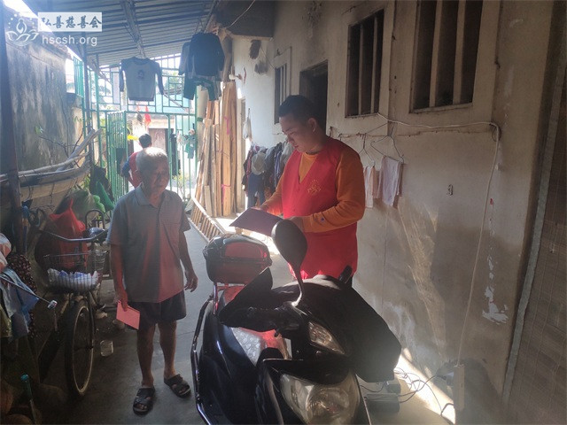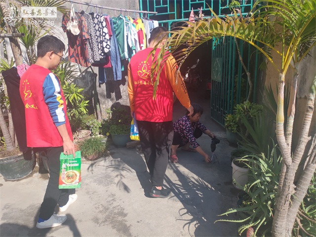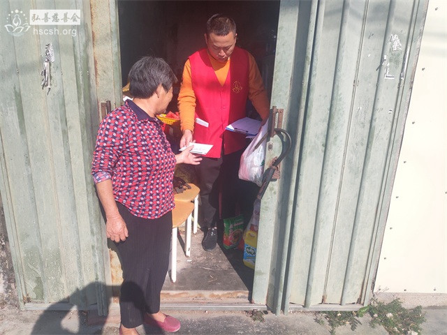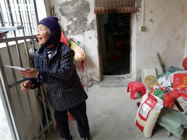 由于章某利老人家这次没在家,义工们把物资和慰问金从窗口放进去。