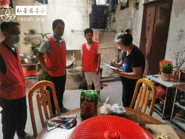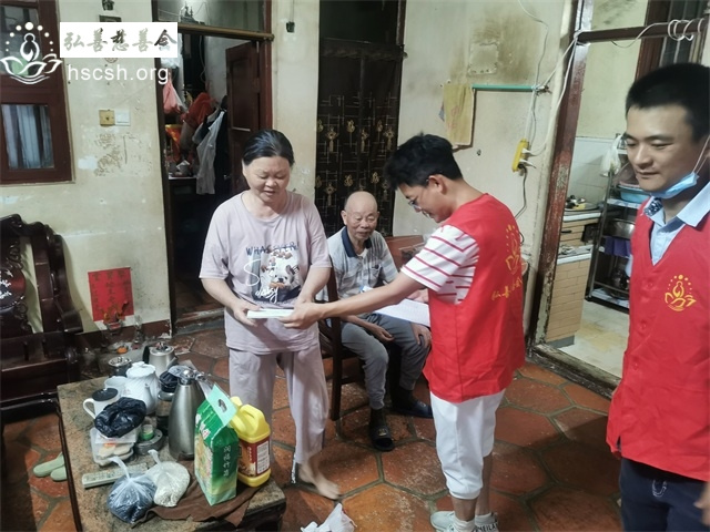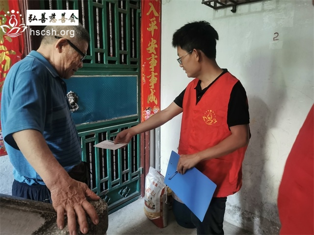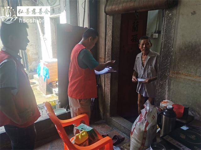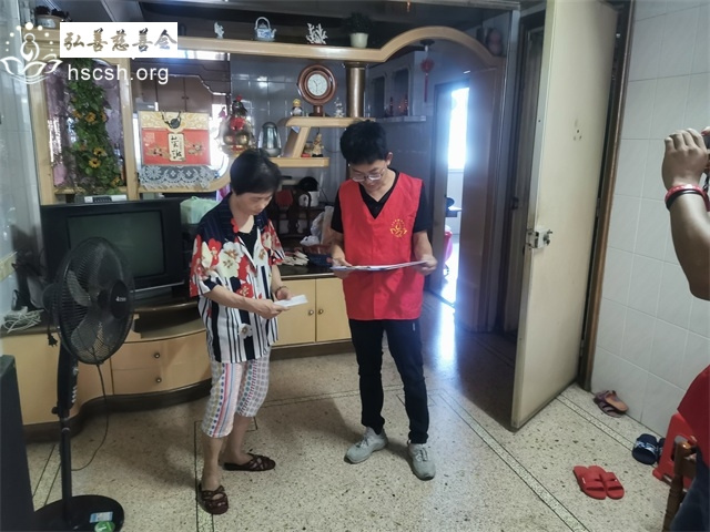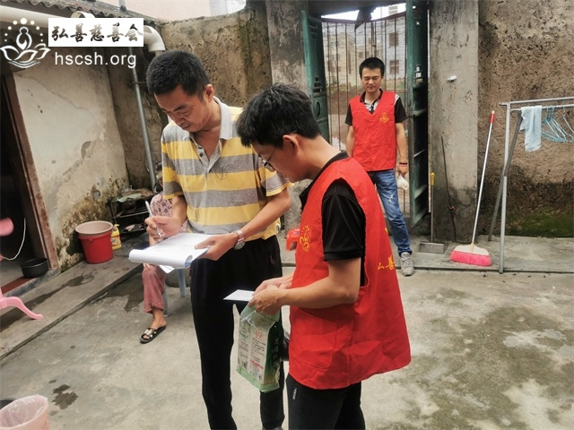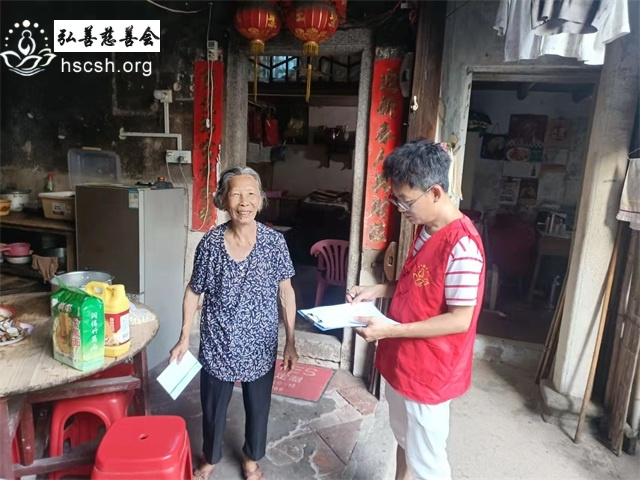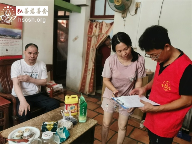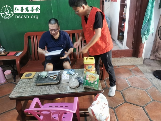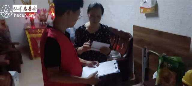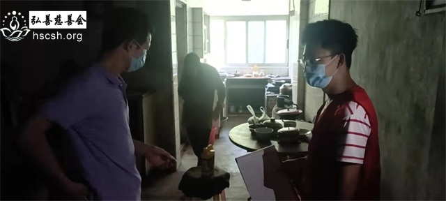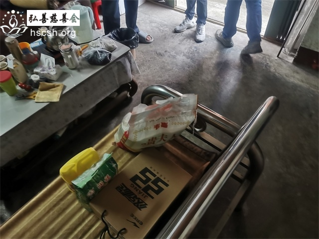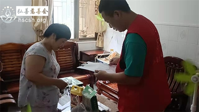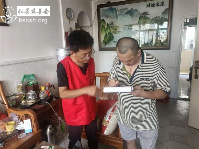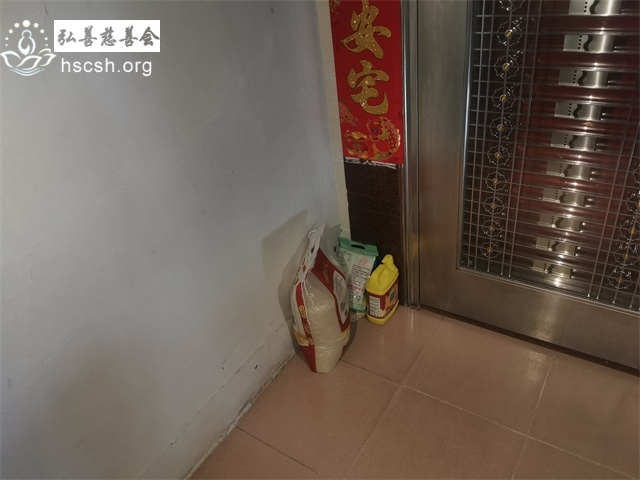 爱心义工去她家中,发觉无人在家,通过电话联系后,将物资放在家门口。