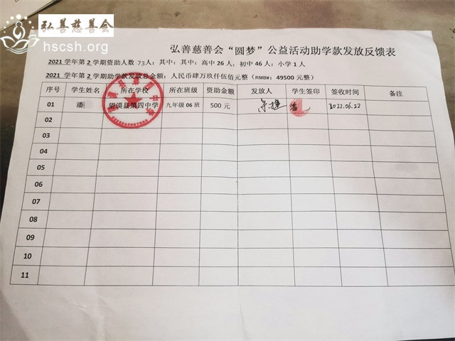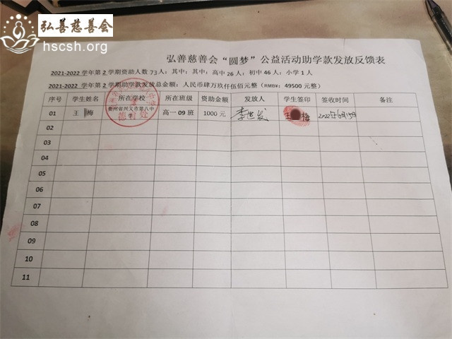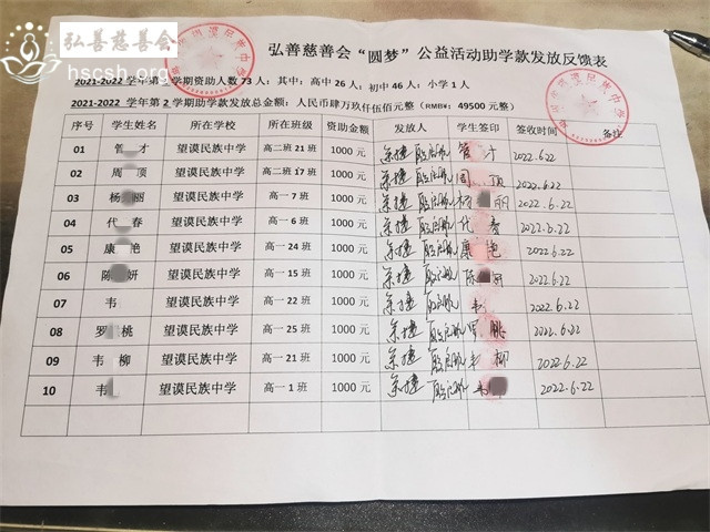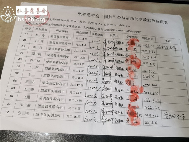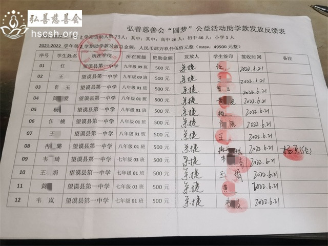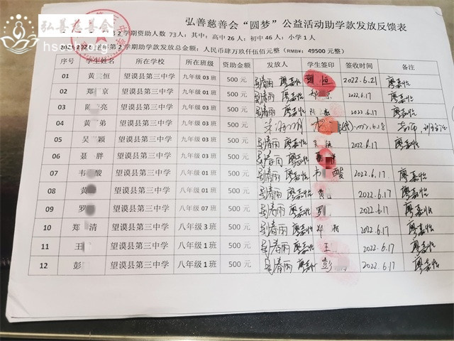 弘善慈善会本学期共资助贫困生73名,高中生26人,初中生46人,小学1人。本学期新增初中生14名。(可点击此处查看新增贫困生资料)以下为发放助学金情况。(应教育局要求,今年开始所有接受资助的孩子需保护隐私打码)