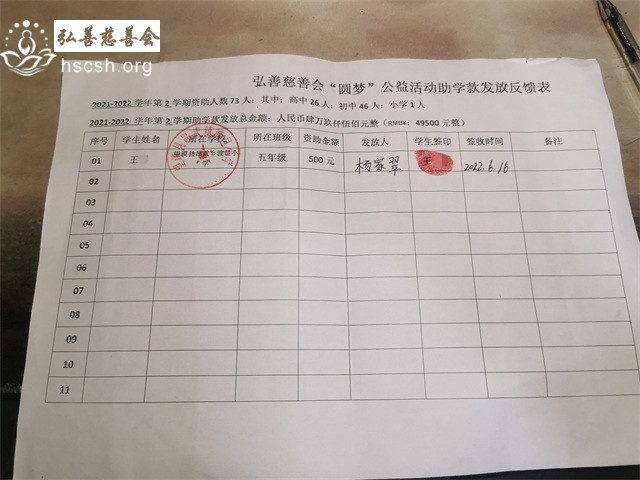 本学期助学金已顺利发放到每个孩子手中,希望孩子们时刻保持健康的心态面对艰难处境,因为那么多知识等着你们去采撷,美妙的生活等着你们去体验。也希望你们在今后的生活中,从微小的事情做起,脚踏实地,创造属于自己的精彩。感谢各界爱心人士对孩子们的关心和帮助。请继续关注圆梦助学!
