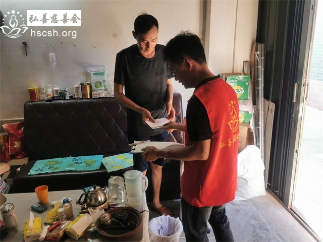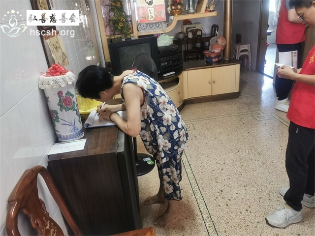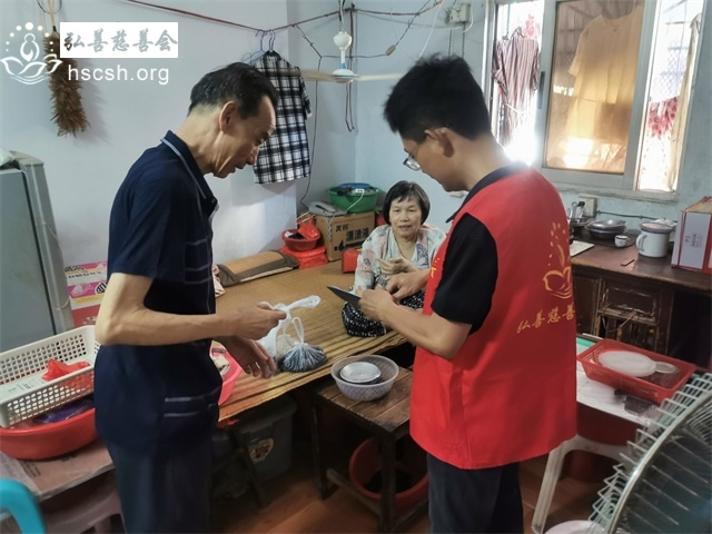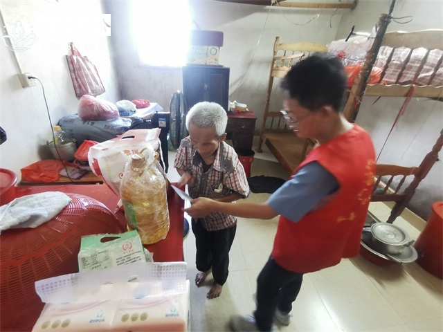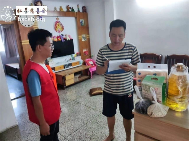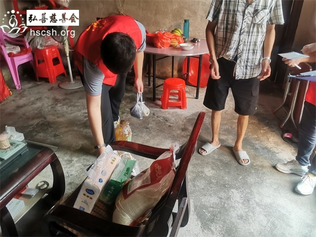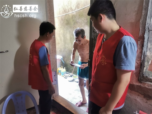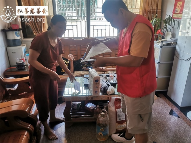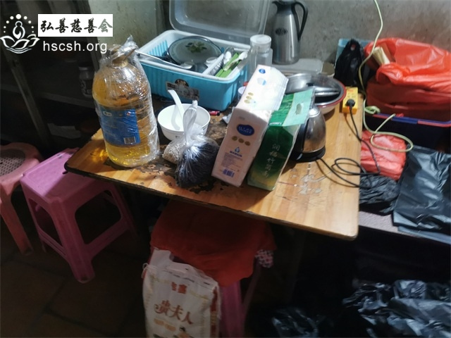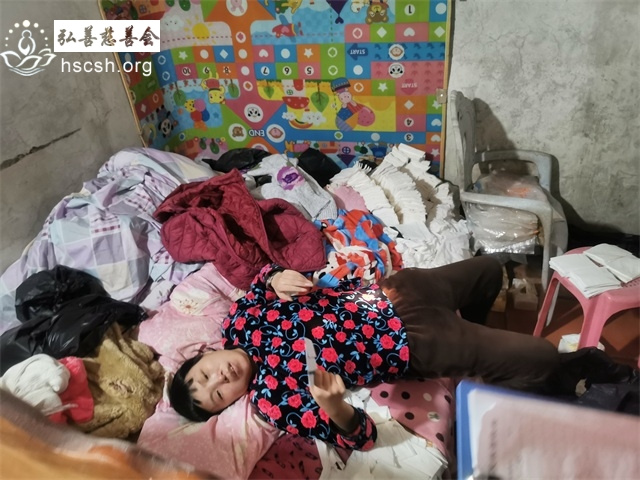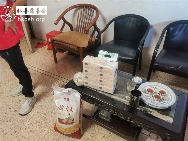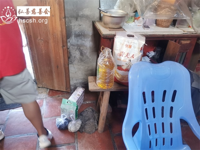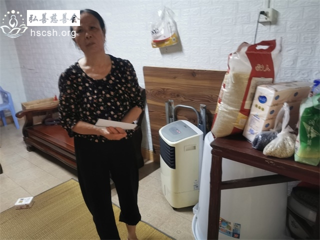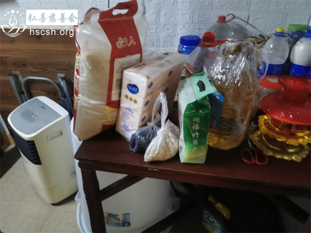 黄某成最近身体不舒服,在医院输液,义工把物资寄放在邻居家中。