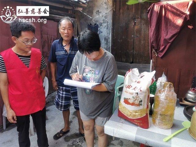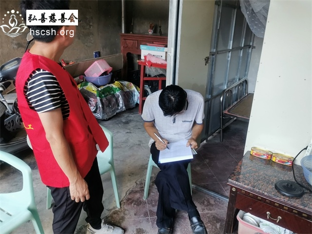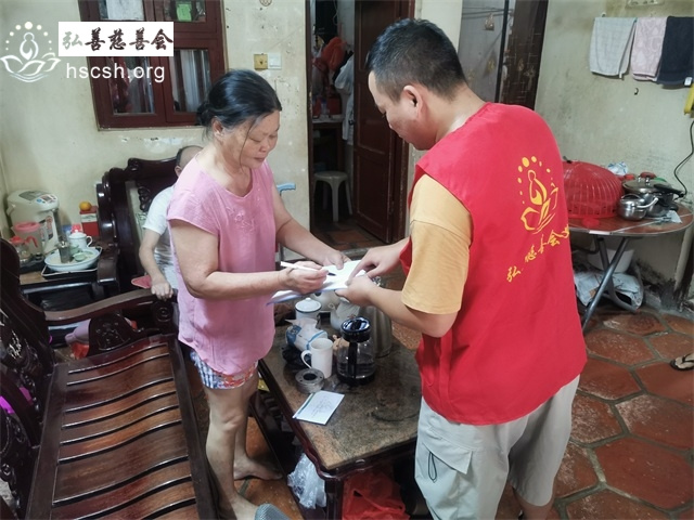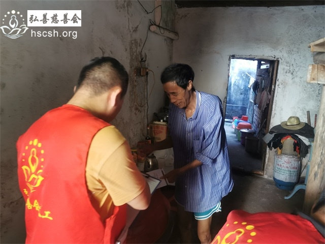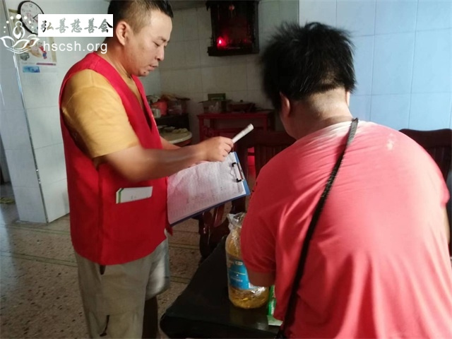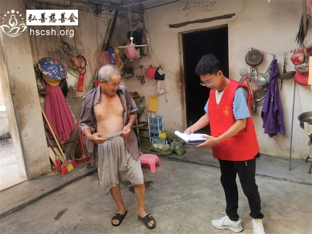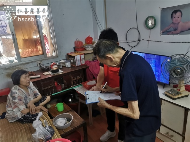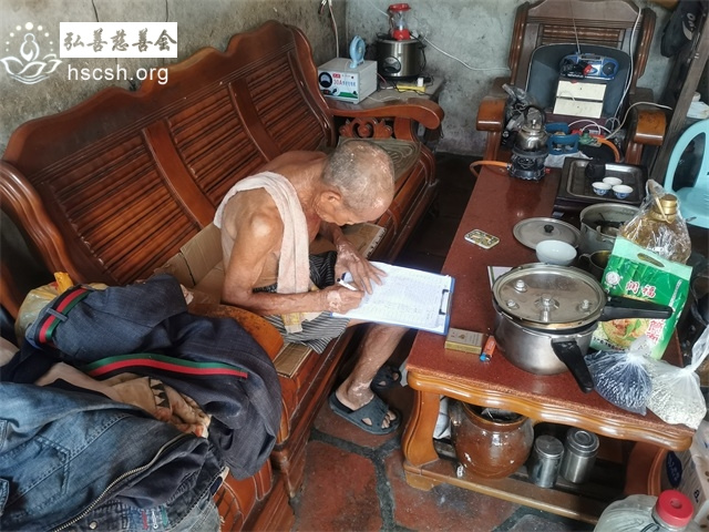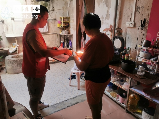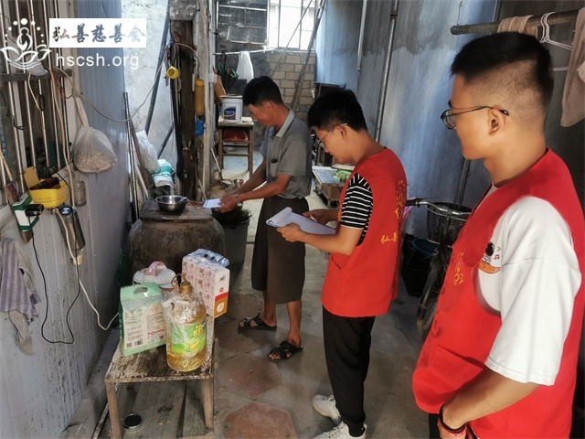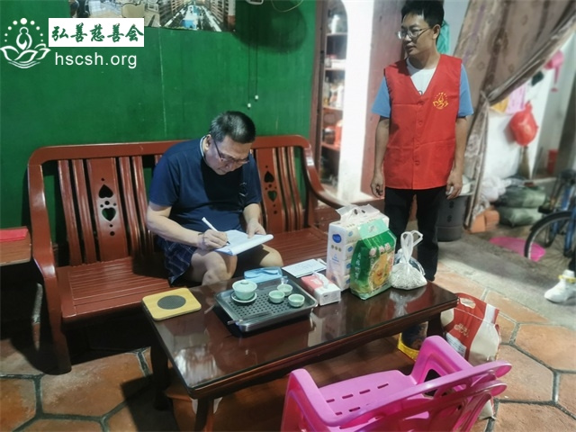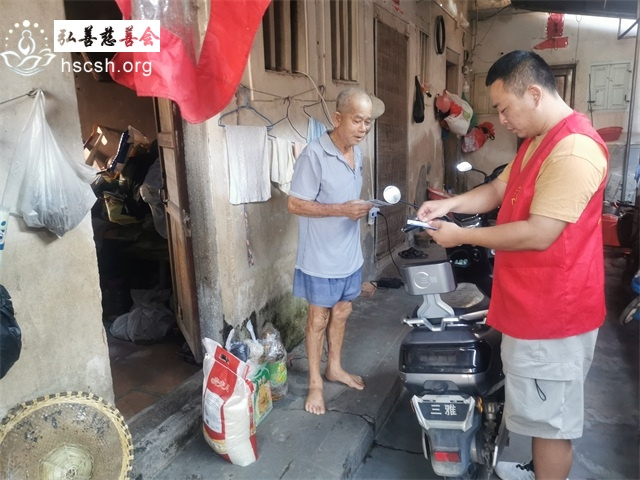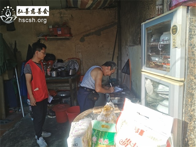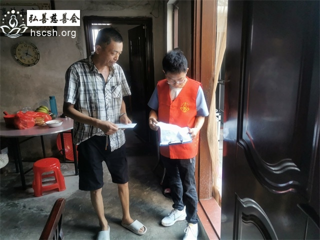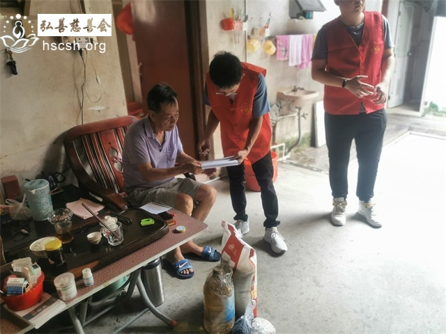 黄某成最近身体不舒服,在医院输液,义工把物资寄放在邻居家中。