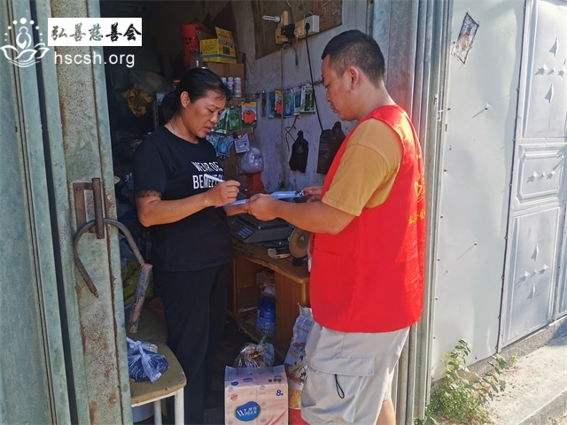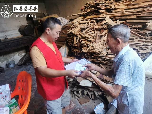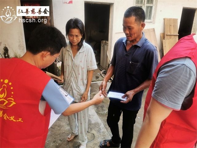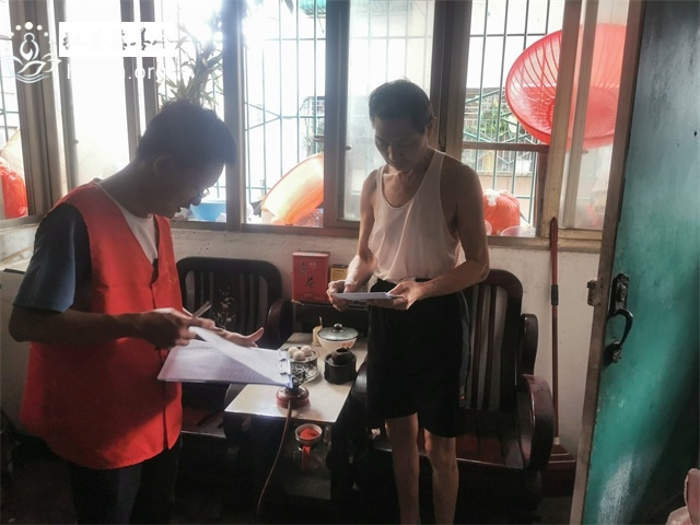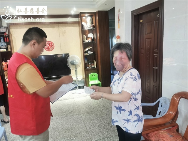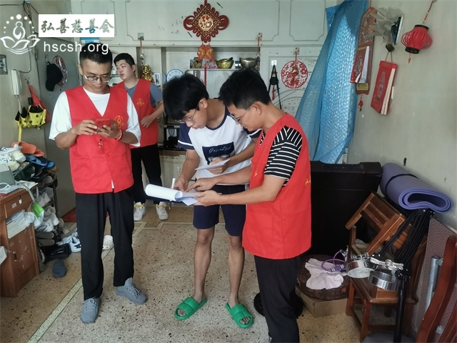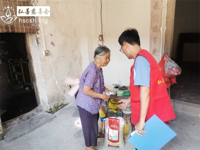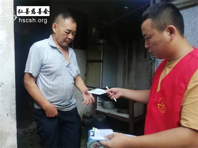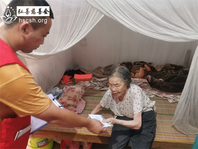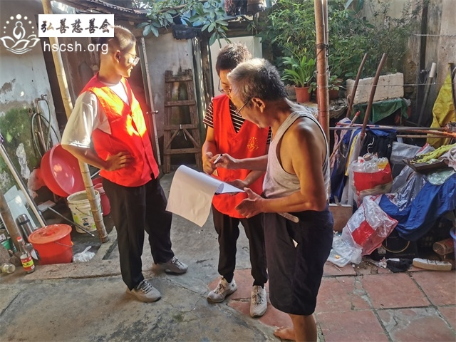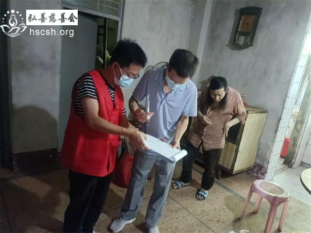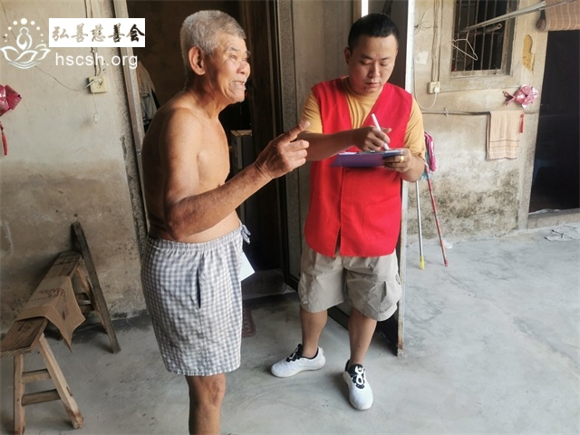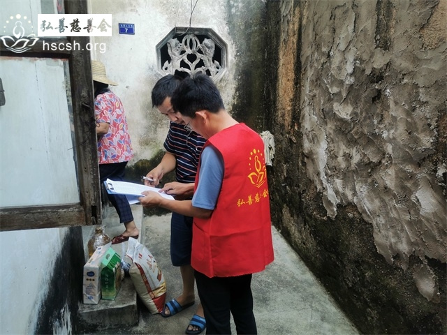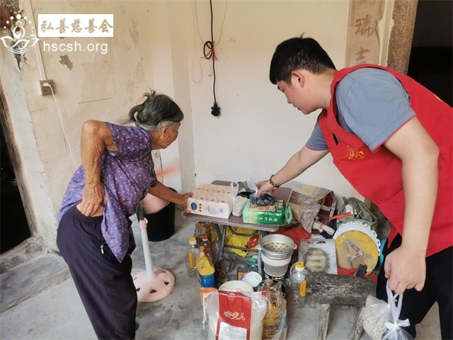 黄某成最近身体不舒服,在医院输液,义工把物资寄放在邻居家中。