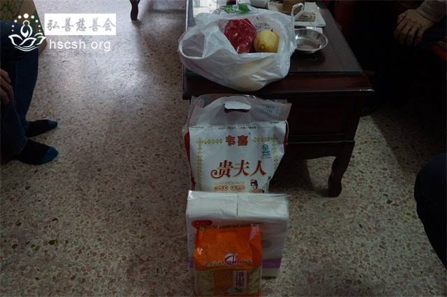 慰问物资:10kg金百合大米1袋、1.8l佳乐宝鲜榨玉米油1瓶、淮山面1包、念佛机1台。