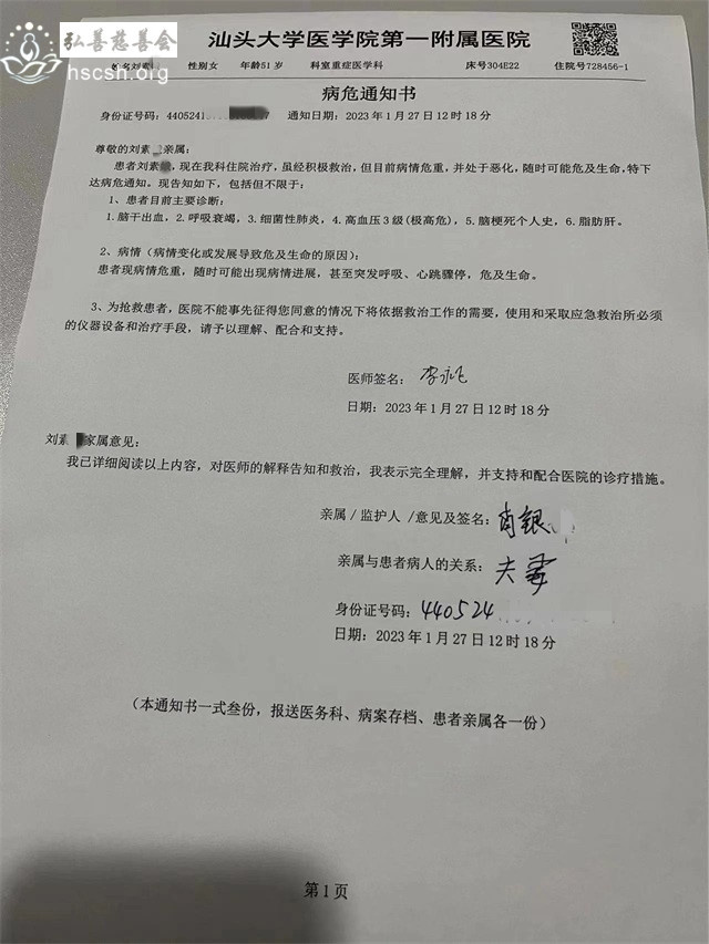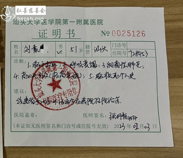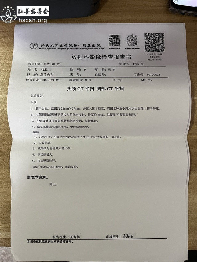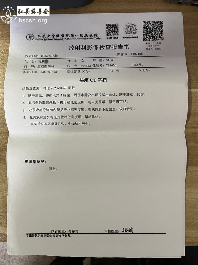 刘素某在1月26号大年初五下午突发疾病晕倒,昏迷不醒,随后送到潮阳人民医院,经CT 拍片和医生诊断为脑干出血需立即送往汕头医院。当天晚上就到了汕头附一医院,急诊CT 拍片结果跟潮阳人民医院的一样,脑干出血。同时刘素某出现了呼吸困难,呕吐,细菌性肺炎的状,在医生建议下送往重症监护室,至14日为止病情还不稳定,很多医药费都是跟亲戚朋友借的,这让原本不富裕的家庭更是雪上加霜。去年7月份刘素某在大峰医院做子宫切除手术,手术费用也是跟亲戚借的,目前债务还没还完,又病倒了,医生说还没渡过危险期,还是昏迷不醒,大概需要 35 万左右的医药费,因家庭收入微薄,生活困难,无法支付高昂医药费。