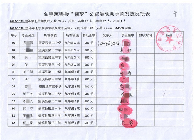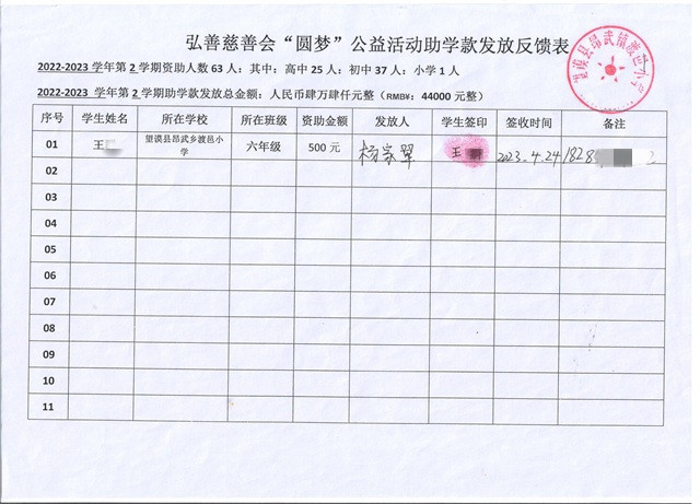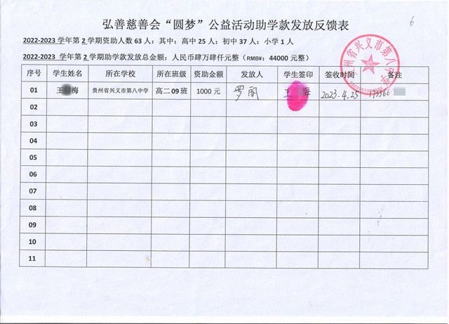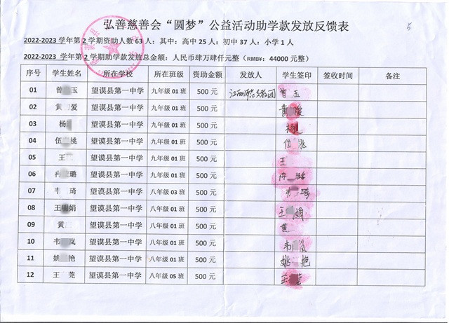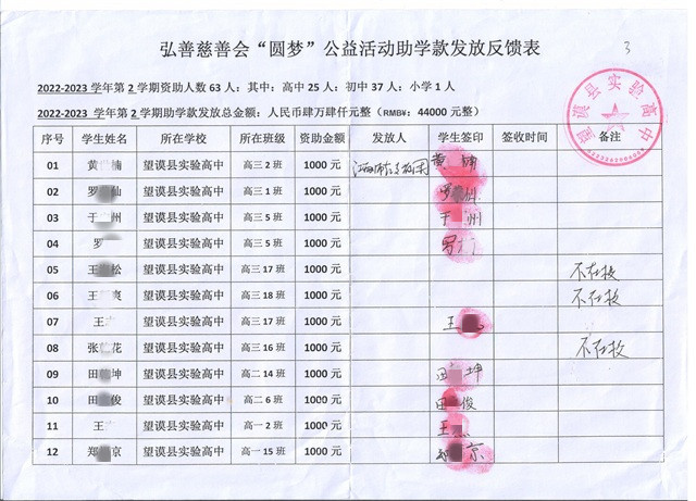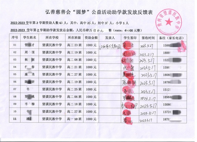 本学期助学金已顺利发放到每个孩子手中,感谢各界爱心人士对孩子们的关心和帮助。慈善会义工将持续关注贫困山区孩子们的就学情况,愿有更多爱心人士加入我们,帮助更多孩子。请继续关注圆梦助学!