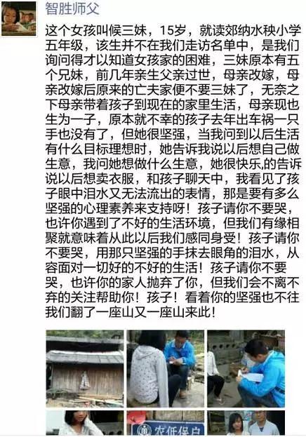 智胜法师公益助学因缘:据法师讲述,他的助学愿望来源于曾经也是留守儿童,贫困使得父亲在他几岁时就常年外出务工,过年则回家一次。小学2年级开始接受出家师父资助,那时母亲生病无钱医治,读初一时想挣钱为母治病,便失学外出打工。但几年下来并没能有多大的改变。之后在南昌佑民寺依本妙和尚剃度,出家后一个月不到,母亲也因犯病掉落水中淹死。幸得本妙和尚带领全寺僧众捐款,让法师回家处理母亲后事。