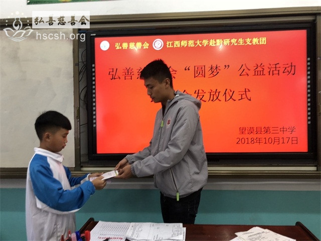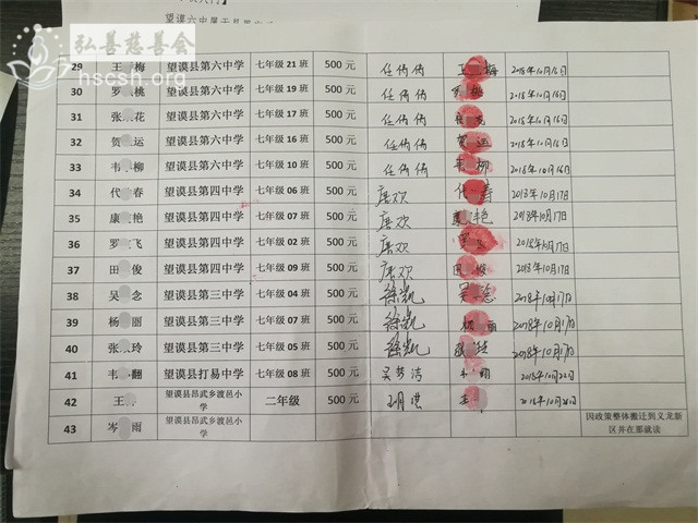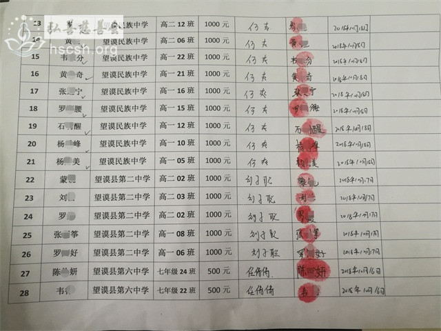 近日,在支教老师们的帮助下,慈善会助学项目的众爱心人士捐赠的助学善款,委托老师们发放到望谟民族中学、望谟第二中学、望谟第三中学、望谟第四中学、望谟第六中学、打易中学、昂武渡邑小学等校的贫困学子手中,此次发放的助学金是2018-2019第一学期的助学金,共计3.3万元。并鼓励受资助学生坚定学习目标,在学校摄取知识,累积改变命运的力量。