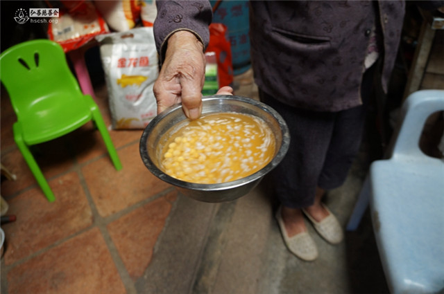 走访当天是农历十五,老人家当天吃素,泡了一些黄豆作为食物